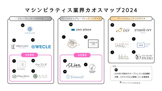 webマーケティング支援事業、『女性専用セミパーソナル プリッツジム』を運営するプライアスタ合同会社(本社:福岡県博多区、代表社員:芝 卓史)は、「マシンピラティス業界カオスマップ2024」を2024年1月11日(木)に公開いたしました。
