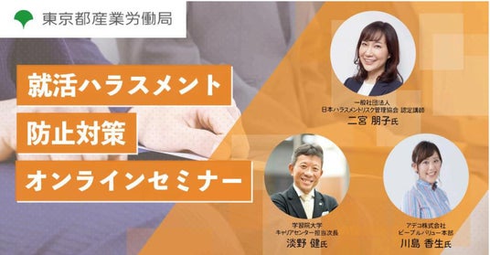 東京都産業労働局が運営する「TOKYOノーハラ企業支援ナビ」上で開催される「就活ハラスメント防止対策オンラインセミナー」に一般社団法人日本ハラスメントリスク管理協会認定講師の二宮 朋子(にのみや ともこ)が基調講演とパネルディスカッションに登壇します。