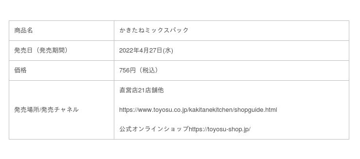 とよす株式会社(本社:大阪府池田市 社長:真山 靖宏)は、百貨店を中心に展開しているブランド「かきたねキッチン」において、『かきたねミックスパック』を2022年4月27日(水)から発売いたします。
