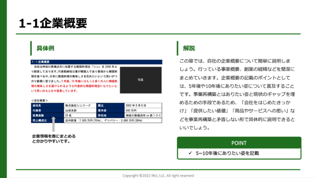 合同会社INUの事業再構築補助金フォーマットでは、事業計画書の内容や項目、図の作り方など必要な要素を漏れなく解説しています。実際の飲食店をモデルケースとしていますので、自社状況をイメージしながら事業計画を作成することが可能になります。