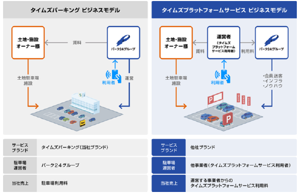 「タイムズプラットフォームサービス」は、タイムズ24をはじめとするパーク24グループが保有する駐車場およびカーシェアリングに関するノウハウやインフラ、効率的な運営・管理を可能にする独自機能等を他社に提供し、他社ブランドでの駐車場事業やカーシェアリング事業の展開を支援するサービスです。ドライバー向け会員制サービス「タイムズクラブ」のポイントがためたり使えたりするほか、法人向けサービス「タイムズビジネスサービス」のタイムズビジネスカードでの精算が可能なため、集客力の向上にも貢献します。