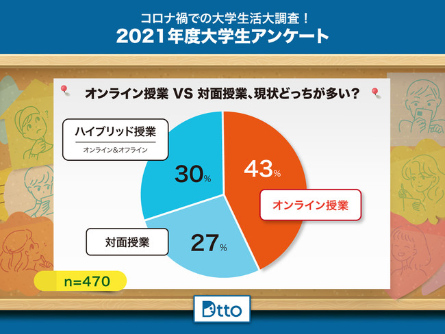 ・オンライン授業(43%)が多く、ハイブリッド授業(30%)も増加