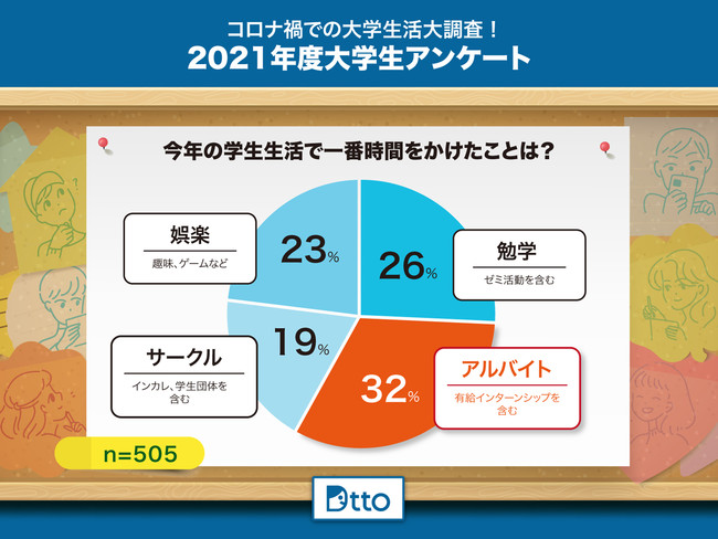 「アルバイト」に注力した大学生が32%を占め、「勉学」(26%)・「娯楽」(23%)・「サークル」(19%)を上回る結果となりました。