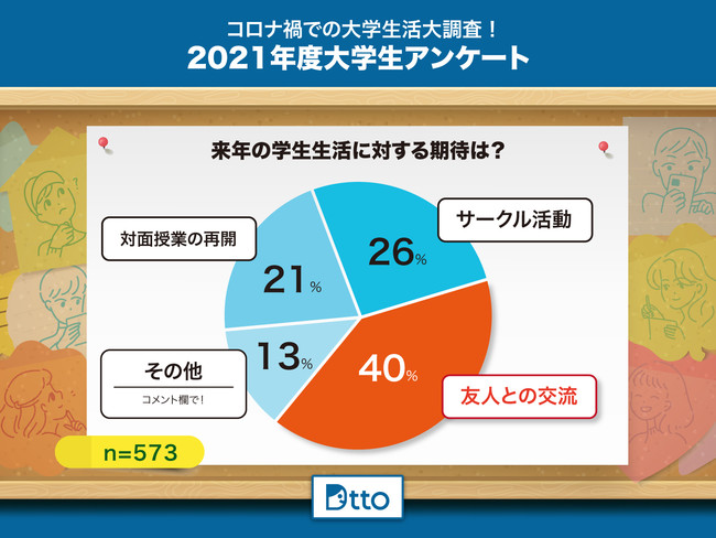 4割の学生が「友人との交流」を期待し、2位はサークル活動(26%)、3位は対面授業の再開(21%)でした。
