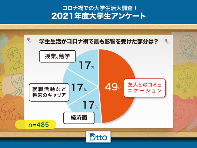 ・友人とのコミュニケーション(49%)がコロナ禍で最も影響された