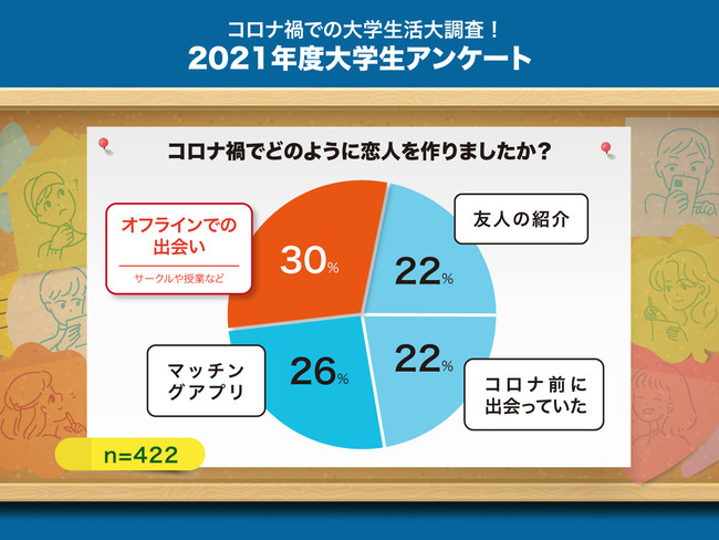 大学生の恋愛事情に関しては「オフラインでの出会い」(30%)が最も多く、2位が「マッチングアプリ」(26%)、3位が「コロナ前に出会っていた」(22%)および「友人の紹介」(22%)でした。コロナ禍に関わらず、オフラインでの出会いは恋人作りのきっかけとなりやすいようです。