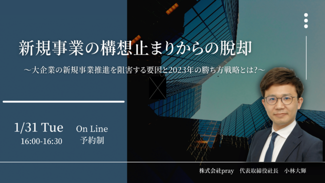 企業の変革パートナーを目指すブティック型コンサルティングファームの株式会社pray(本社:東京都、代表取締役:小林大輝)は、2023年1月31日(火)に、「新規事業の推進」をテーマに大企業の新規事業担当者向けのセミナーを開催します。