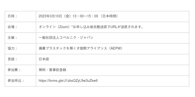 コペルニク・ジャパンは、プラスチック廃棄物の課題理解およびその解決に関する取り組み促進に向けて、2023年3月から2024年5月まで全6回の予定でオンラインウェビナーシリーズを開催します。