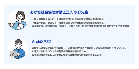 建築・内観パース生成AI「ArchiX(アーキエックス)」を運営するアクチュアル株式会社(本社:京都市中京区、代表取締役:辻 勇樹)は、助成金申請に強みを持つあかね社会保険労務士法人(所在地:大阪市北区、代表社員:山中 晶子)と共同で、建設業界の「2024年問題」をAIと助成金で解決するための実践的な連載記事の配信を開始いたしました。
