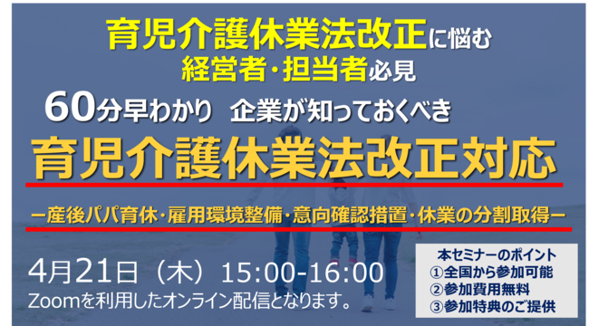 本セミナーを活用いただき、育児介護休業法改正対応が可能な体制を構築し、従業員が働き易い職場の実現と人財定着を踏まえた持続的な企業経営を実現してください。