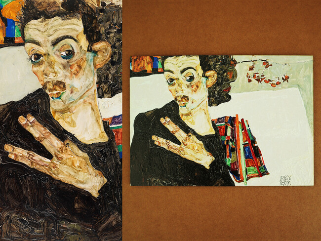何かを問いかけるような眼差しを向けるシーレの自画像は、ゆがんだ姿勢に額に深く刻まれた皺、窪んだ目、ハサミのようにまっすぐ伸びた指が目立つ特徴的な作品です。あえて背景の起伏を抑えて、人物や木の枝、カラフルなテキスタイルモチーフの部分を激しい凹凸で強調させています。シーレらしい個性的な構図やタッチを指で触って感じることができる新感覚のポストカードです。
