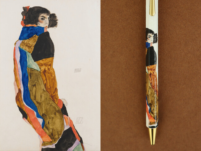 シーレが恋人のモアをモデルに描いた作品からは、彼女の凛とした美しい佇まいと、激しい感情の動きが伝わってきます。モアが身を包んでいる幾何学的で色彩豊かな衣装の色面に残る大きな筆致を高低差のある凹凸で表現することで、作品のコントラスト効果を高めています。モアのエキゾチックで魅力的な表情が楽しめる印象的なペンです。