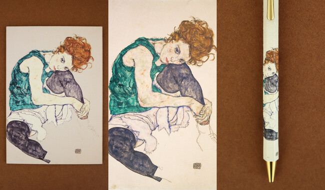 床に座って挑発的なポーズで視線を送る女性はシーレの妻エーディトがモデルになっており、色鮮やかな赤い髪と緑の服が対照的に描かれています。シーレ独特のゆがんだ線描写を凹凸で引き立たせながら、女性の体にはあえて大きな起伏をつけずに、なめらかな肌の質感を表現しています。見る人に強烈な印象を残す原画の世界観をそのままポストカードとペンに閉じ込めました。