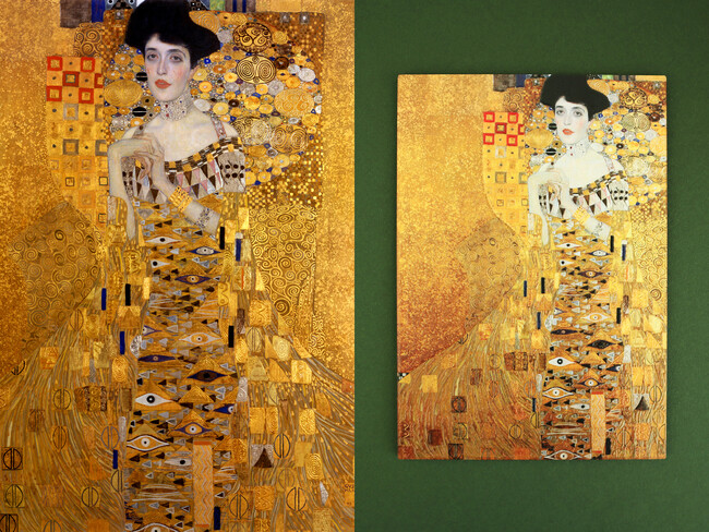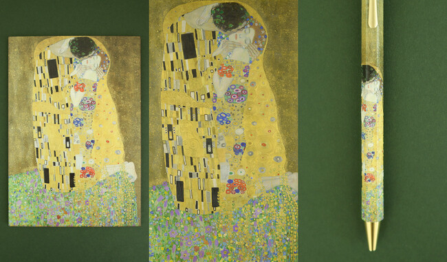 官能的で生々しい人物描写と美しい色彩で描かれた風景とが溶け合う、クリムトらしい独特のタッチで描かれた豪華な作品です。全体にびっしりと入っている装飾的な模様の一つ一つに細かい起伏をつけて、クリムトの描き出す繊細優美な世界観を最大限に引き出しています。気持ちが華やぐ煌びやかなポストカードとペンを手元に置いて、暮らしの中で鑑賞をお楽しみいただけます。