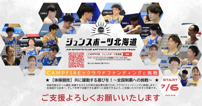 ジュンスポーツ北海道、クラウドファンディングに挑戦!体操競技の普及と成長を目指し、新たなステージへの飛躍を図るため、ジュンスポーツ北海道が7月6日(木)からクラウドファンディングプロジェクトを始動します。全日本選手権出場実績を持つ私たちのチームは、選手の環境整備や大会参加支援、普及活動の強化など、さまざまな目標に向けて資金のサポートを必要としています。ぜひとも皆さまのご支援とご協力をお願い申し上げます。