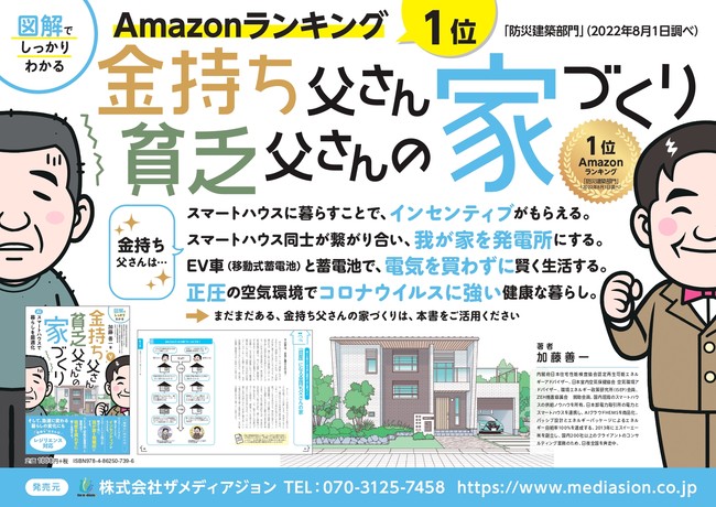 工務店・ビルダーに対しスマートハウスのコンサルティングを行っている株式会社絆ジャパン(本社:東京都新宿区西新宿、代表取締役社長:増田 文彦)と業務提携し、物価高騰ラッシュ、家計負担増時代の中で、お客様の支出を減らし、インセンティブがもらえる暮らしが出来るスマートハウス(Smart2030零和の家)の普及活動を行っているスマートハウスの第一人者であるエスイーエー株式会社 代表取締役 加藤 善一氏の新書籍『図解でしっかりわかる 金持ち父さん 貧乏父さんの家づくり』が、8月5日(金)ザ・メディアジョンより発売されました。本書は、先行予約段階でAmazon「防災建築」カテゴリでランキング1位を獲得しています。※2022年8月1日時点