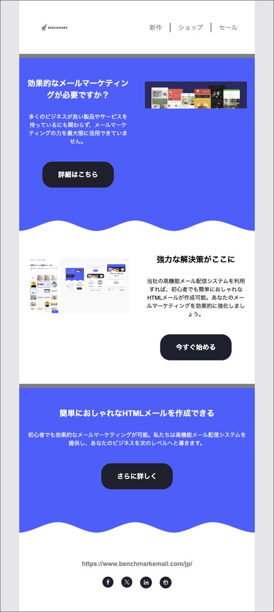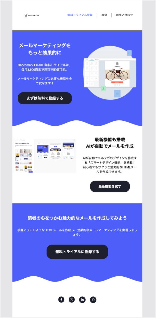 今回はBenchmark Emailの日本サイトトップページを元に、AIがこちらのようなメールデザインと文面を提案してくれました。