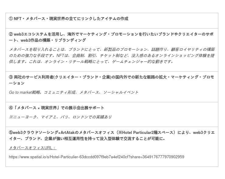 ニューヨークで開催されたNFT.NYC2023で、ArtAtak社の創業者Anton氏とご縁をいただき、イベント後も何度か打ち合わせをさせていただく中で、互いのリソースとネットワークを活用することで、web3領域における新たな価値創造をグローバルでできると確信し、この度ArtAtak社と提携させていただくことになりました。ArtAtak社は既にweb3領域でアメリカ、フランス、イギリスで数多くの実績があり、今後一緒に事業を展開できることは非常に光栄で、これから楽しみです。