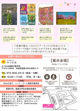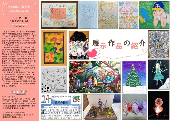 特定非営利活動法人 寝屋川市民たすけあいの会(大阪府寝屋川市、共同代表理事 中務飛鳥、後藤雅子)は、寝屋川市内の精神科の医療機関や作業所に通っているメンバーの作品展示会を行います。このアート展は、2015年3月に第1回を開催し、それから毎年約100作品を展示。3日間という短い開催期間にもかかわらず約400名の方が来場するアート展へと発展しました。