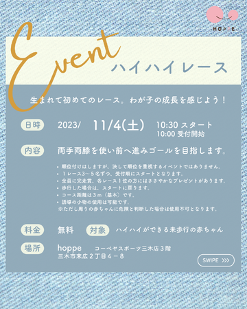 特定非営利活動法人ほっぺ(代表:大森 奈津子)による赤ちゃん向けイベントが、2023年11月4日(土)にコーベヤスポーツ三木店3階にて、「hoppeハイハイレース~Kobeya CUP!~」を開催いたします。KOBEYA SPORTSとの共催となります。