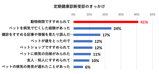 □受診のきっかけは、「動物病院ですすめられて」が50%と圧倒的に多い。ワクチン接種やフィラリア予防で来院の際にすすめられたのがきっかけになったと考えられ、昨年に比べ9ポイント上がっていることから、動物病院による健康診断啓発の成果が見られる。
