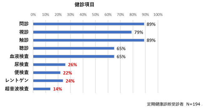 受診が多いのは、問診 89%、視診79%、触診89%。聴診65%、血液検査65%。腎疾患や泌尿器疾患、糖尿病等を発見するための尿検査は26%(昨年31%)、消化管内の寄生虫の有無や、消化管内の出血や消化状態を診るための便検査は 22%(昨年25%)、肺や心臓、内臓の異常を診るためのレントゲン検査24%(昨年27%)と、いずれも昨年より減少しました。腫瘍や心臓疾患の発見に役立つ超音波(エコー)検査は14%が受けています。