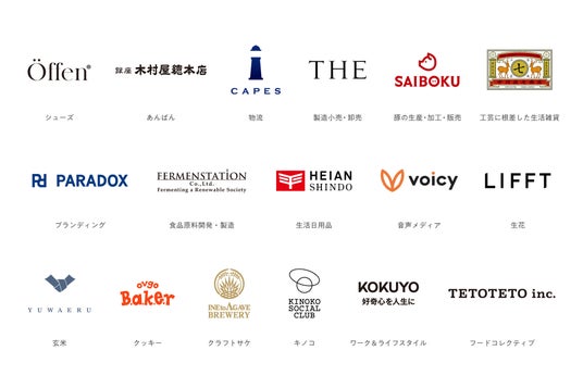 Öffen(シューズ)、木村屋總本店(あんぱん)、CAPES(物流)、THE(製造小売・卸売)、SAIBOKU(豚の生産・加工・販売)、中川政七商店(工芸に根差した生活雑貨)、PARADOX(ブランディング)、FERMENSTATION(食品原料開発・製造)、平安伸銅工業(生活日用品)、Voicy(音声メディア)、LIFFT(生花)、YUWAERU(玄米)、ovgo Baker(クッキー)、稲とアガベ(クラフトサケ)、KINOKO SOCIAL CLUB(キノコ)KOKUYO(ワーク&ライフスタイル)、TETOTETO(フードコレクティブ)
