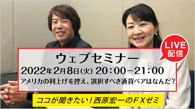 セントラル短資FX株式会社(本社:東京都中央区、代表取締役社長:松田 邦夫)は、2022年2月8日(火)20時から無料ウェブセミナー『アメリカの利上げを控え、選択すべき通貨ペアはなんだ?』(ココが聞きたい!西原宏一のFXゼミ)を開催します。