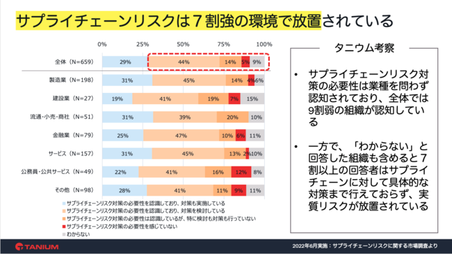 業界唯一の統合型エンドポイント管理(XEM)プロバイダであるタニウム合同会社(東京都千代田区、代表執行役社長:古市 力、以下タニウム)は本日、「サプライチェーンリスクに関する市場調査」の結果を発表しました。本調査の結果から、国内におけるサプライチェーンリスクへの対策実施の遅れが明らかになりました。
