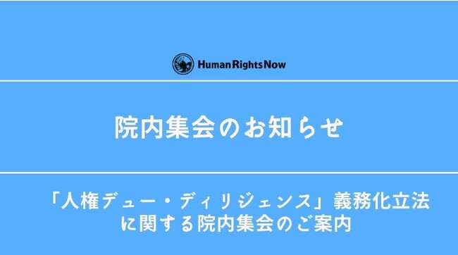 早速ですが、長年にわたり人権の分野で取り組んで参りました私ども、超党派『人権外交』を推進する議員連盟」と「人権外交を超党派で考える議員連盟」と国際NGO「ヒューマンライツ・ナウ」は、下記の要領で、「人権デュー・ディリジェンス」義務化立法に関する院内集会を開催いたします。