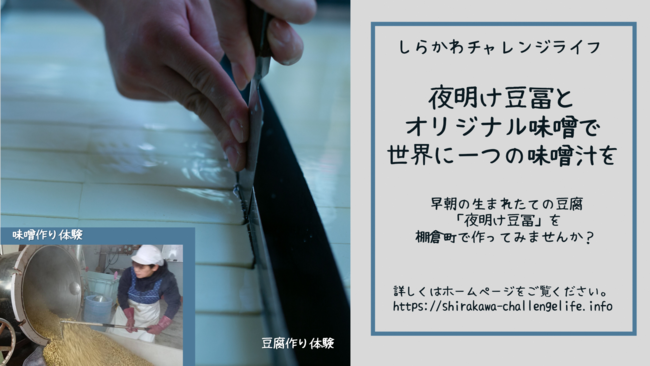 棚倉町にある大椙食品で「夜明け豆富」作りと味噌づくりの体験を行います。早朝の豆腐屋さんでしか出会えない生まれたての豆腐「夜明け豆富」は温かく、普通の豆腐よりも豆の味を濃く感じるそう。作った豆腐と味噌を自宅に持ち帰り、世界にひとつだけのオリジナル味噌汁を作ることができます。