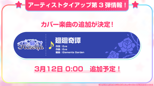 株式会社Craft Egg(本社:東京都渋谷区 代表取締役:森川 修一、以下、Craft Egg)と、株式会社ブシロード(本社:東京都中野区 代表取締役社長:橋本 義賢、以下、ブシロード)の共同制作によるスマートフォン向けゲーム「バンドリ! ガールズバンドパーティ!」(以下、ガルパ)は、3月12日(土)0時より、アーティストタイアップ第3弾「Roselia×Eve」の実施とともに、タイアップを記念したカバー楽曲『廻廻奇譚』を追加することを発表いたしました。また、アーティストタイアップ第4弾「Pastel*Palettes×ZAQ」を3月18日(金)15時より実施することを発表いたしました。