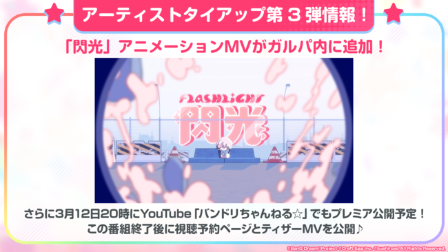 3月12日(土)0時より、『閃光』のアニメーションMVが追加されることを発表したほか、本アニメーションMVのティザー映像を、YouTube「バンドリちゃんねる☆」にて公開いたしました。また、同ページにて3月12日(土)20時より、本アニメーションMV(ゲームサイズver.)のプレミア公開が決まっており、現在視聴予約が可能になっております。※公開されるアニメーションMV(ゲームサイズver.)はガルパ内に追加されるアニメーションMVと同様の内容となります。