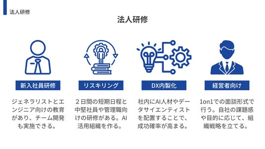さらに、リスキリングプログラムや経営者向けの1on1面談形式の研修も提供し、組織全体のスキルアップを支援します。これにより、社内にAI人材やデータサイエンティストを配置し、DX内製化を促進します。