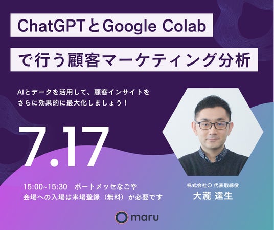 株式会社〇(本社:愛知県名古屋市、代表:大瀧 達生)は、2024年7月17日(水)にJapan IT Week【名古屋】にて開催される「PR TIMESコネクティングステージ」へ登壇いたします。当社代表取締役の大瀧が、顧客のマーケティングに関する分析をChatGPTを通して行う方法をご紹介します。