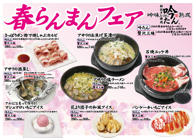 株式会社プレジャー(本社:愛知県尾張旭市、代表取締役:小山和紀)は、【秘伝タレ焼肉 吟味熟成 吟たん】にて春限定メニュー【春らんまんフェア】を2023年3月4日より販売開始いたします。