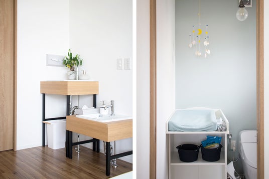 内装には、白を基調とした壁紙に加え、一部には木目調のアクセントウォールを取り入れました。シンプルでありながらも温かみのある、落ち着いた雰囲気を実現しています。また、中途壁を使ってプライベート感を保ちながらも、空間を広く感じさせました。さらに、グリーンが映える空間で、自然のエネルギーを感じながら心地よく過ごせます。
