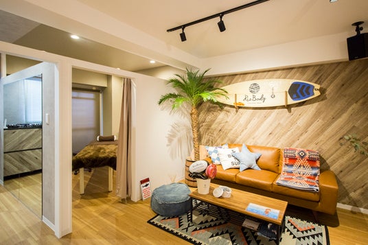 美容整体とパーソナルトレーニングを組み合わせ、利用されるお客様のお悩みにしっかりと応えるために設計。西海岸をイメージしたリラックスできる雰囲気で、訪れるだけでリフレッシュできるように仕上げました。エントランスに飾られたサーフボードには、店名のサインが施されており、まるで海辺のカフェに来たかのような軽やかさとフレンドリーさを演出しています。