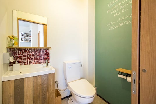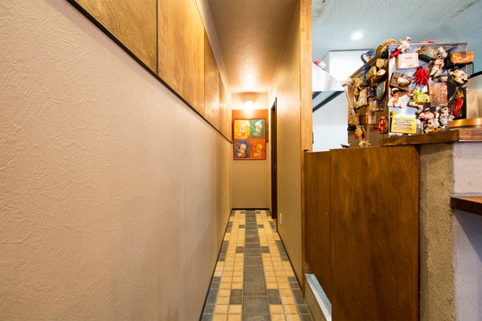 まず、天井には躯体表しが採用。これにより空間全体が力強い印象を、逆に壁のクロスでシンプルでありながら柔らかい印象を与えています。そして、床は土間コンクリートとタイル張りを組み合わせて、オシャレでありながらも実用的な空間を演出しています。木の温もりを感じさせるカウンターや棚が、空間に暖かさをプラス。また、木材は部分使いで、自然な優しさをもたらしています。そして、所々にあしらわれたブルーのモザイクタイルが、空間にアクセントを加え、視線のポイントとなっています。