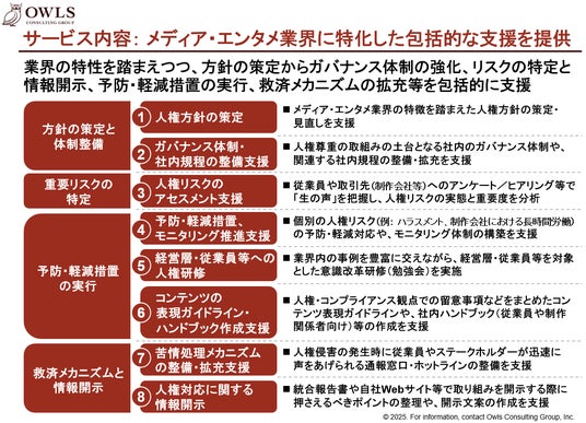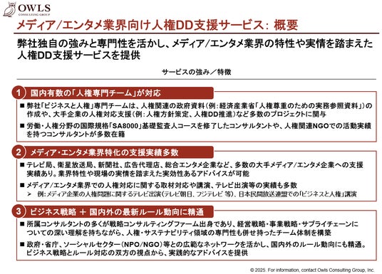 株式会社オウルズコンサルティンググループ(東京都港区/代表取締役CEO 羽生田慶介)は、このたびメディア・エンターテインメント業界向けに特化した人権デューディリジェンス(DD)支援サービスの提供を開始しました。