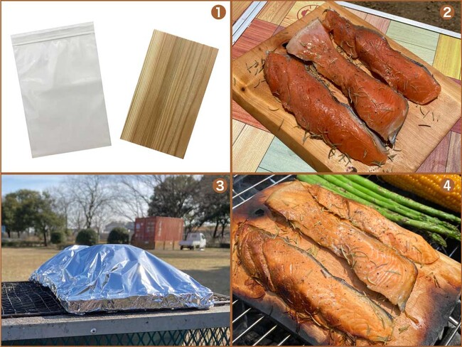 板が焦げて出る煙で食材が燻され、独特の風味が付くので、燻製のような香り高いバーベキューが楽しめます。板とコンロさえあれば、いつもとは一味違うBBQが手軽に楽しめるので、日本でもキャンパーを中心に普及し始めています。最近ではBBQ場やグランピング施設などでも採用されている最新のBBQスタイルです。