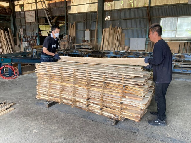 乾燥中に出た板の反りや曲がりを整えて、プランクのサイズにカットします。なるべく端材が出ないように工夫して、カットしてもらっています。