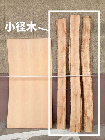 ▲「小径木」(写真右)とは胸の高さの直径が26cm以下の木材のこと。家具等の用材には細くて向かない(画像提供:広葉樹コンシェルジュ及川さん)