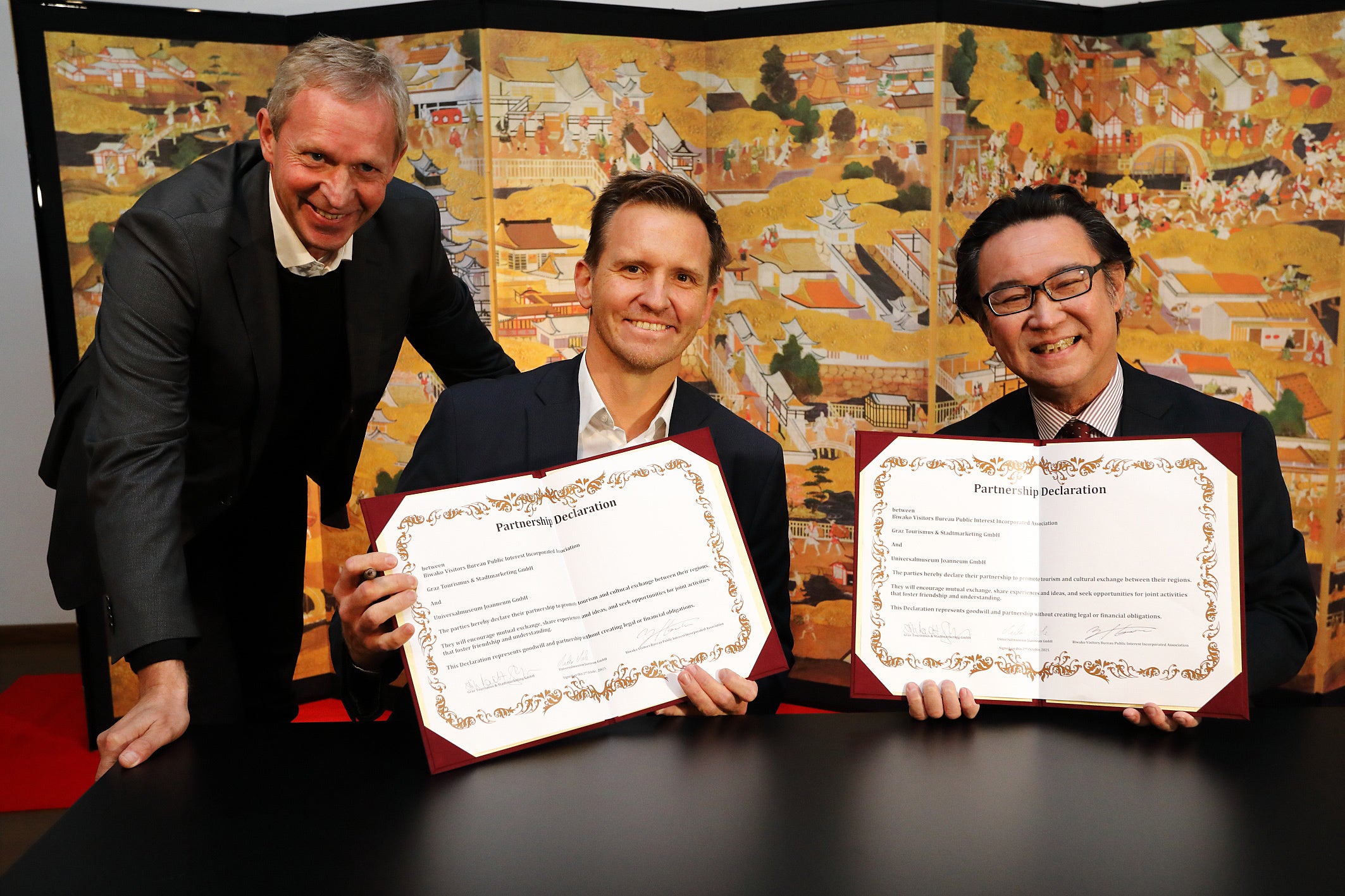 左から、グラーツ市観光局CEO ディーター・ハルト=シュトレマイヤー氏、州立博物館ユニバーサル・ヨアネウム代表 マルコ・メレ博士、びわこビジターズビューロー 原田佳和氏 (C) Universalmuseum Joanneum / J.J. Kucek