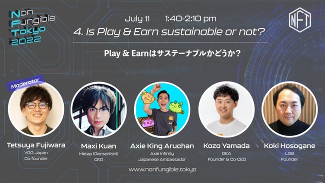 YGG Japan Co-Founder(株式会社ForN CEO)の藤原哲哉氏がモデレーターを務め、GensoKishi Online(Metap Inc.)CEO Maxi Kuan氏、Axie Infinityジャパンアンバサダー アルちゃん、PlayMining(Degital Enterteiment Asset Pte. Ltd.)Co-CEO 山田耕三氏ら、Play&Earnの最前線で活躍される方々とともに登壇し、セッションを行いました。