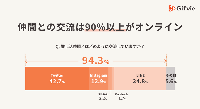 推し活仲間がいるか尋ねた問いでは、4割以上の人が「いる」と回答。仲間との交流方法についてはTwitterが42.7%と最も多く、続いてLINE 34.8%、Instagram 12.9%で、9割以上の人が推し活仲間とオンラインで交流していることがわかりました。