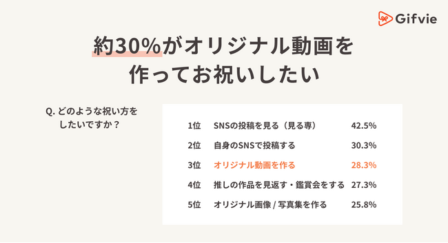 また、どのような方法でお祝いをしたいかについてたずねた問いでは、「SNSの投稿を見る(42.5%)」「自身のSNSで投稿する(30.3%)」に続き、28.3%の人が「オリジナル動画を作る」と回答。フリー回答では「オリジナルムービー をつくる(Z世代/女性)」「応援動画を作る(ミレニアル世代/男性)」「お祝いコメントを集めたい(X世代/男性)」などの声が挙がり、推しにオリジナル動画を贈る「推し活」需要が増加していることがわかりました。