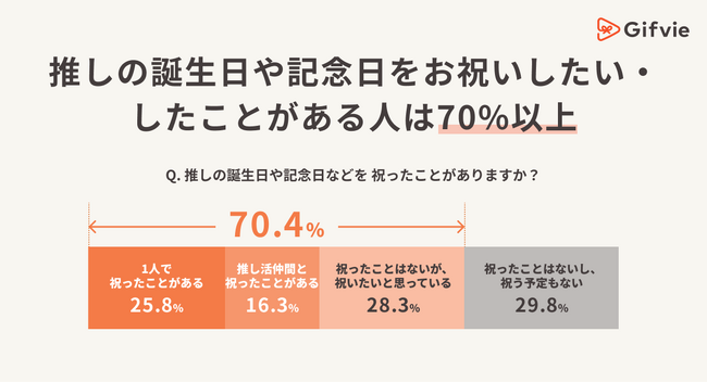推しの誕生日や記念日などを祝ったことがあるかどうかについてたずねた問いでは、「祝ったことがある」「祝いたいと思っている」と回答した人が7割を越えました。