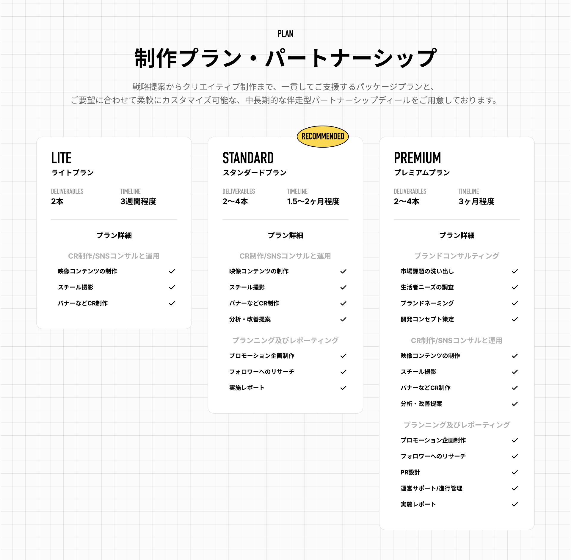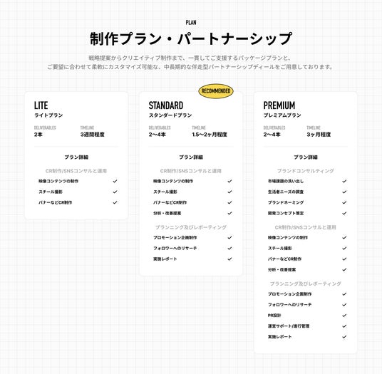 戦略提案からクリエイティブ制作まで、一貫してご支援するパッケージプランと、ご要望に合わせて柔軟にカスタマイズ可能な中長期的な伴走型パートナーシップディールをご用意しております。