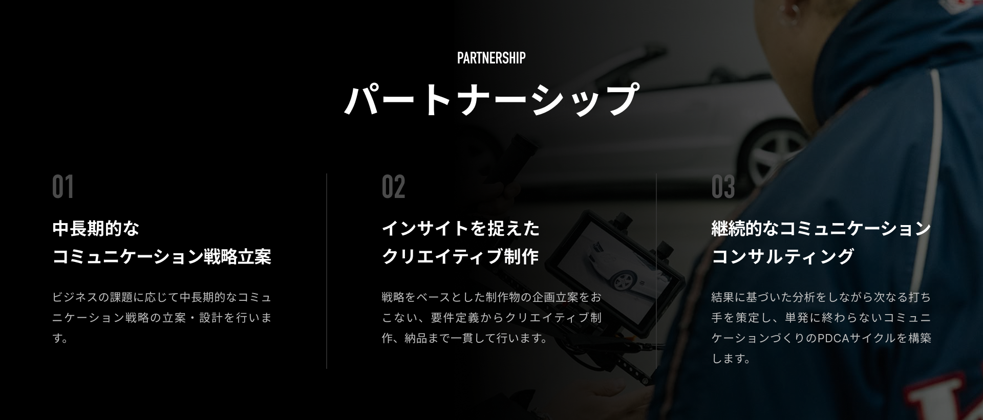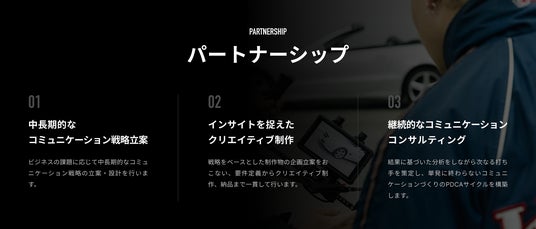 クルマ文化への知見と独自のコミュニティを活かし、ブランド構築、制作、SNS運用までをワンストップでサポート。対象クライアント様をお持ちの広告代理店様との協業も見据えた柔軟なプラン設計をご用意。